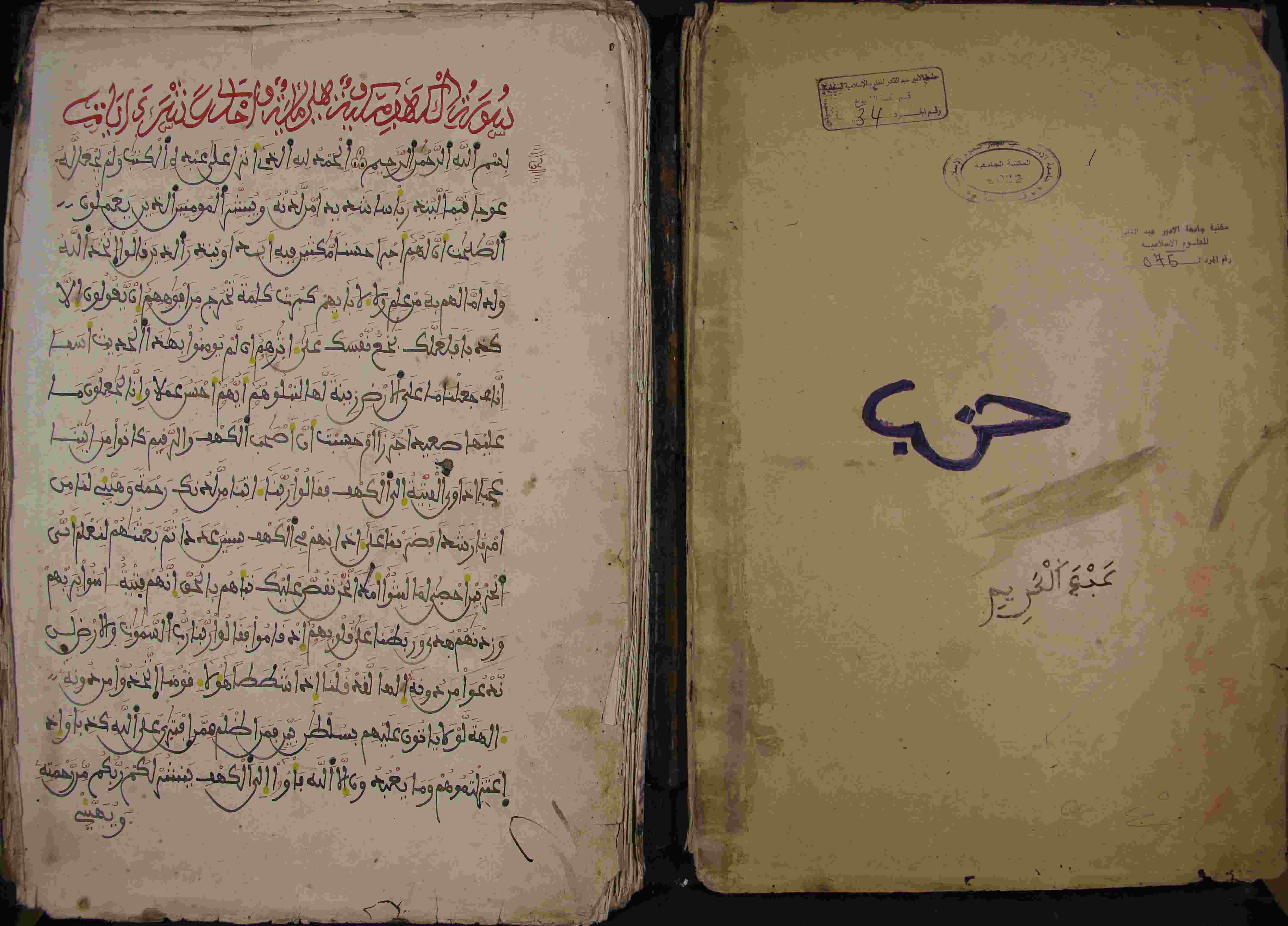 Description: أوله : " بعد البسملة، سورة الكهف مكية ومدنية احدى عشر آيات..."/آخره : " تم الربع الثالث بتاريخ السابع والعشرين من جويلية الموافق للخامس والعشرين من جمادى الأول "، نوع الخط نسخي، التجليد عادي، حالة المخطوط حسنة، بداية المخطوط في الورقة الأولى، نهاية المخطوط في الورقة 49، المخطوط مرقمن، رقم المخطوط 34 م، مصدر المخطوط : مكتبة الشيوخ.