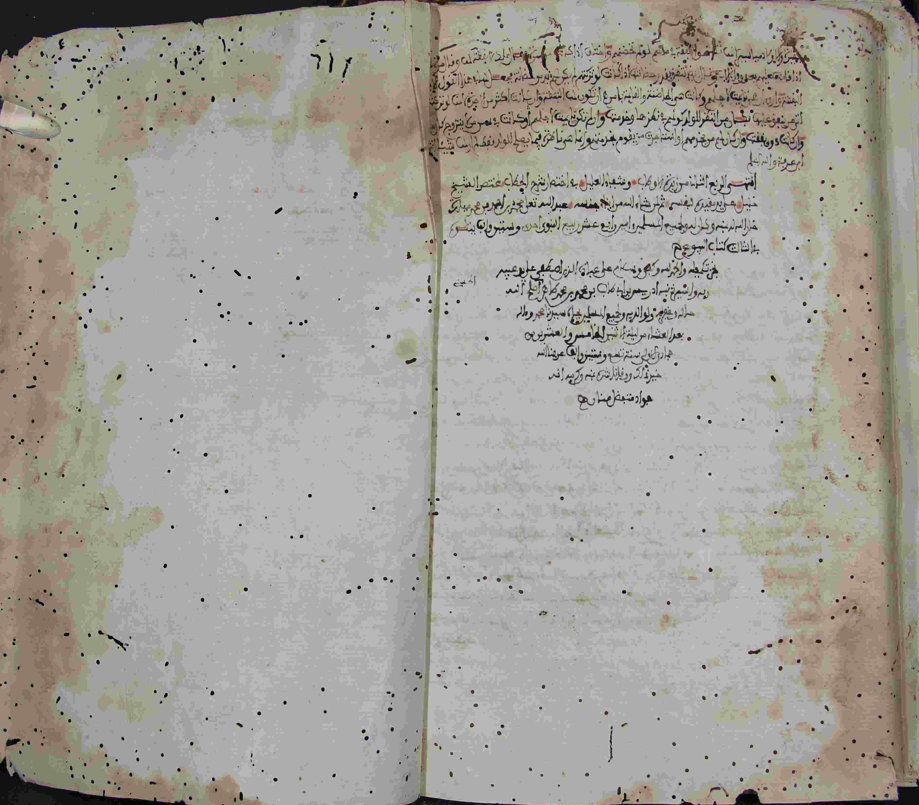 | Description: | أوله : " كتاب الحج قوله باب فرض الحج وسنة العمرة..."/آخره : " فيما يصلح للولد وفطام ( ) شيئا ابن عرفة والله أعلم "، نوع الخط مغربي، التجليد عادي، حالة المخطوط حسنة، هذا الربع الثاني، ألف بتاريخ رابع عشر ربيع النبوي إحدى وستين وألف، نسخ بتاريخ الخامس والعشرين من جمادى الأولى سنة تسع وستين وألف، عليه تعليقات بالحواشي، تملكه محمد بن الشيخ عبد الكريم الفكون 1230هـ.، بداية المخطوط في الورقة الثالثة، نهاية المخطوط في الورقة 176، المخطوط مرقمن، رقم المخطوط 806 م، مصدر المخطوط : زاوية الشيخ الحسين سيدي خليفة (ميلة). |