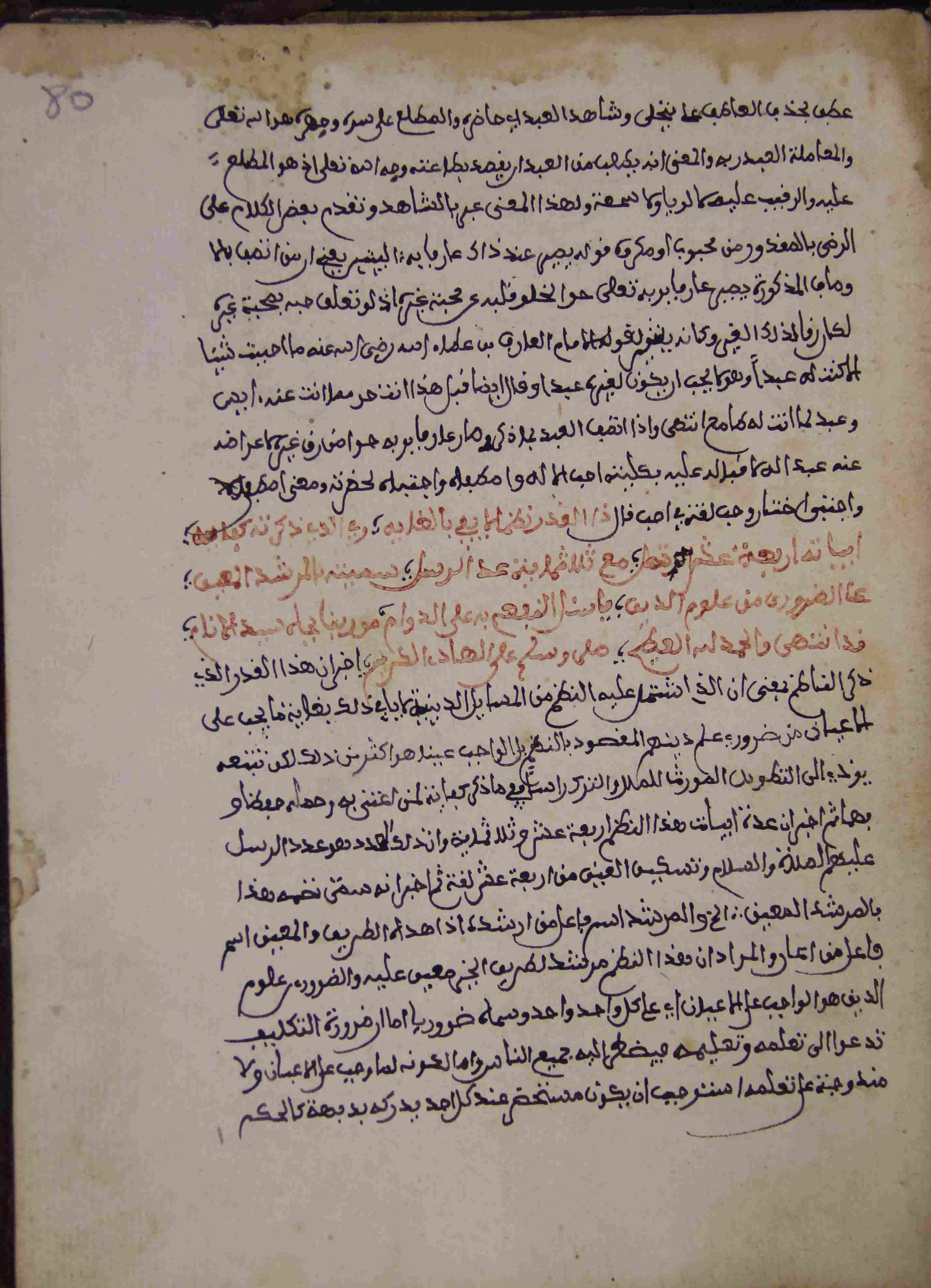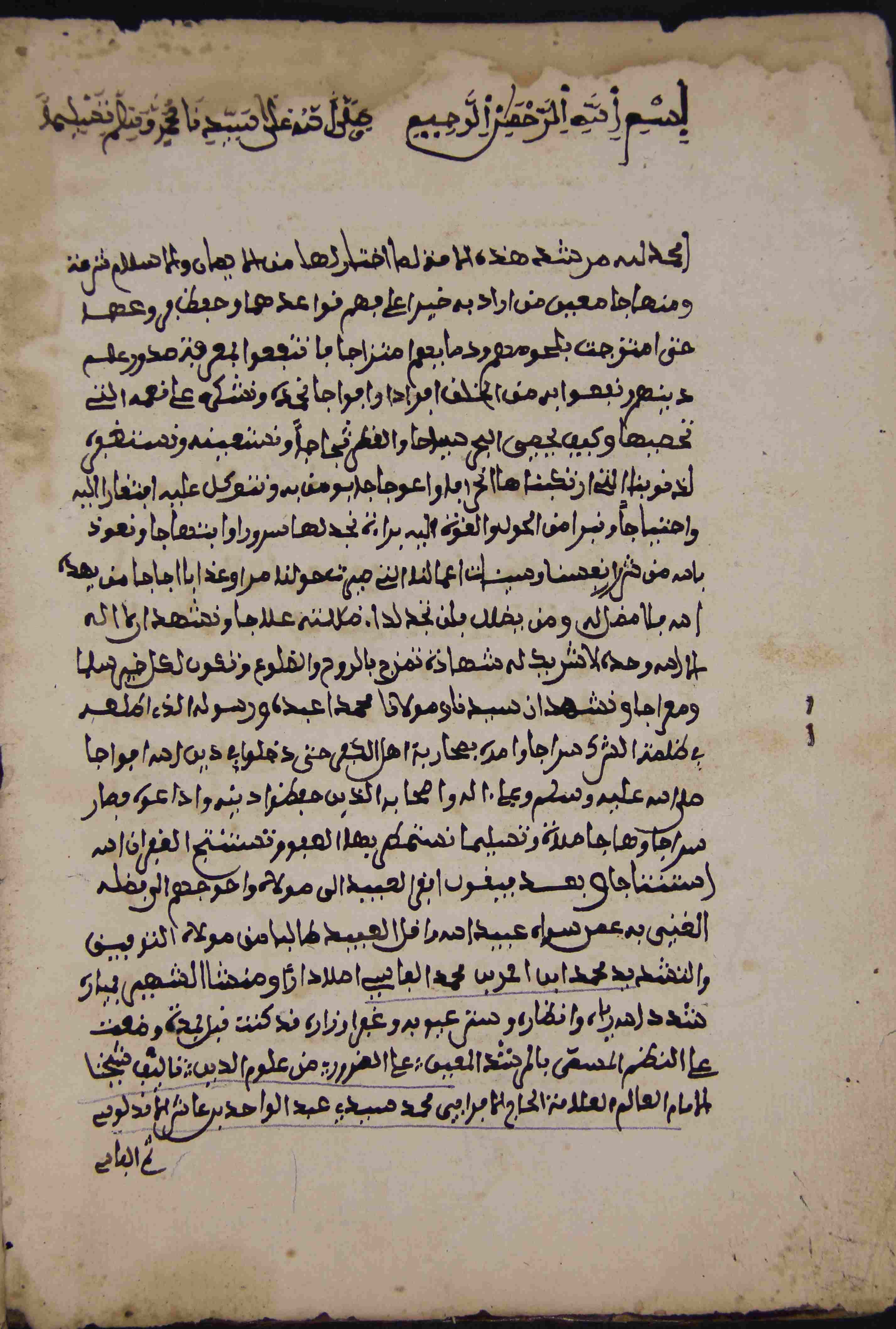 | Description: | أوله : " بسم الله الرحمان الرحيم صلى الله على سيدنا محمد وسلم تسليما الحمد لله من مرشد هذه الأمة لما اختار لها من الإيمان..."/آخره : " شرح ذا القدر نظما لا يفي بالغاية...صلي وسلم على الهادي الكريم "، نوع الخط مغربي، التجليد عادي، حالة المخطوط متوسطة، بداية المخطوط في الورقة الأولى، نهاية المخطوط في الورقة 80، المخطوط مرقمن، رقم المخطوط 324 م، مصدر المخطوط : مكتبة الشيخ نعيم النعيمي. |
