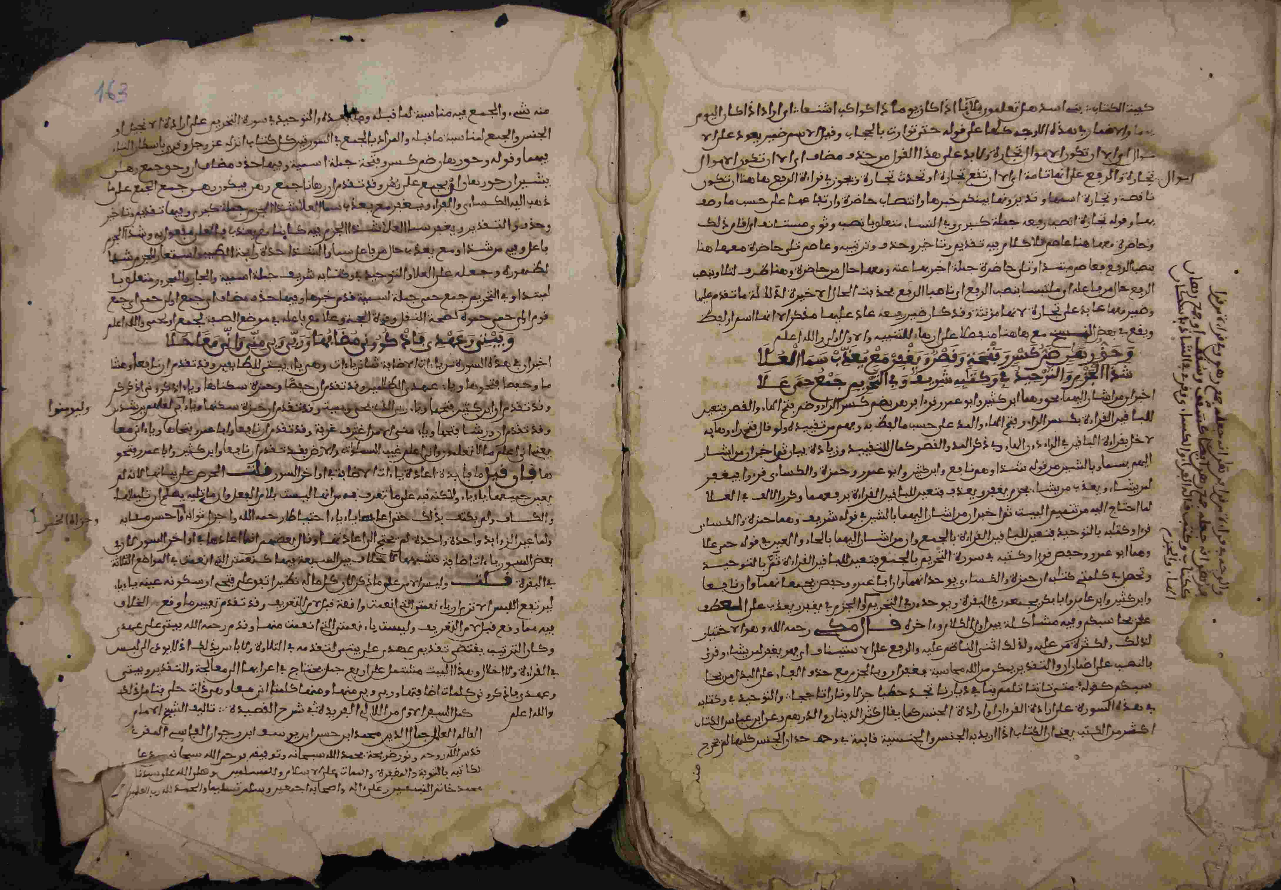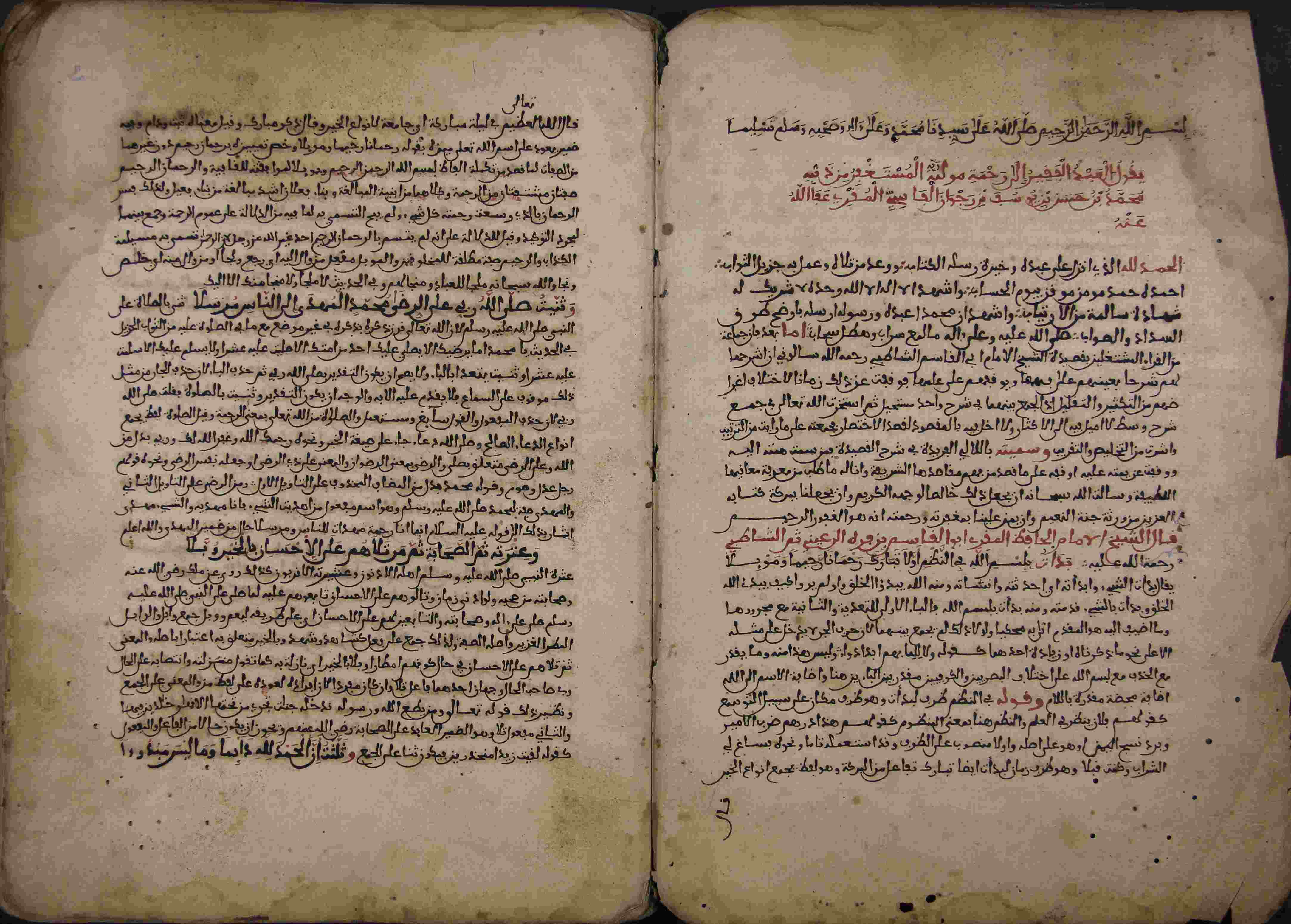 | Description: | أوله : " بسم الله الرحمان الرحيم صلى الله على سيدنا محمد وعلى آله وصحبه وسلم تسليما، يقول العبد الفقير إلى رحمة نولاه المستغفر من ذنبه محمد بن حسن بن يوسف..."/آخره : " كمل السفر الأول من اللالئ الفريدة في شرح القصيدة تأليف الشيخ الإمام العالم العامل جمال الدين محمد بن حسن بن يوسف بن رجوان الفاسي المقرئ "، نوع الخط مغربي، التجليد مزخرف، حالة المخطوط متوسطة، بهامشه تعليقات، بداية المخطوط في الورقة الأولى، نهاية المخطوط في الورقة 162، المخطوط مرقمن، رقم المخطوط 67 م، مصدر المخطوط : مكتبة الشيخ نعيم النعيمي. |