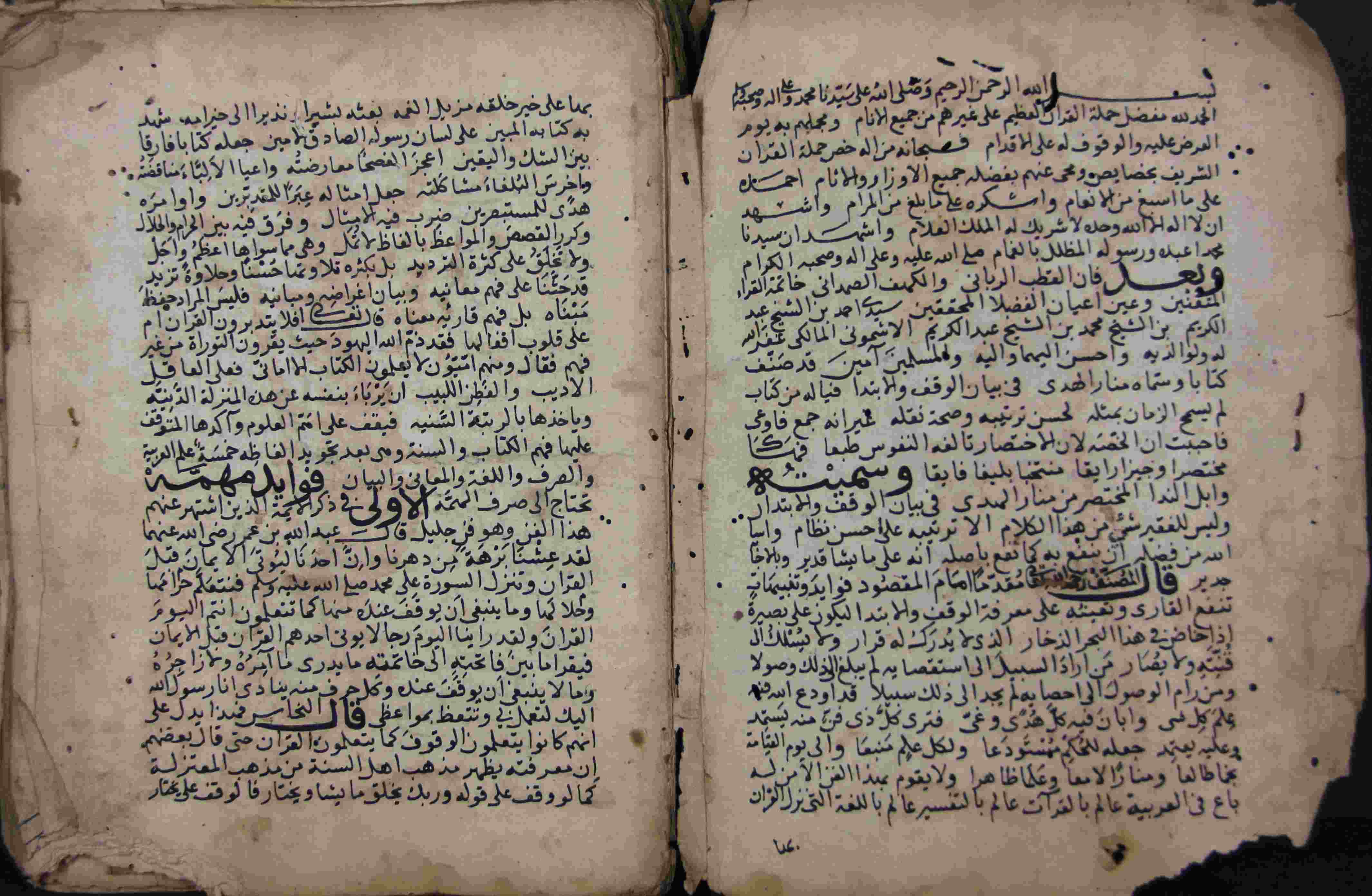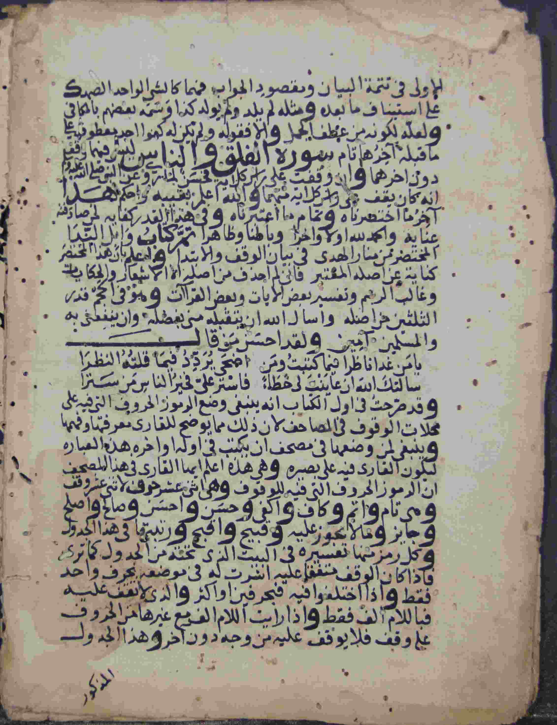 Description: أوله : " بعد البسملة الحمد لله مفضل حملة القرآن العظيم على غيرهم من جميع الأنام..."/آخره : " فلا يوقف عليه من وجه دون آخر وهذا الجدول المذكور "، نوع الخط مشرقي، التجليد مزخرف، حالة المخطوط متوسطة، عليه آثار الرطوبة، عليه تعليقات بالهامش، مبتور الآخر، بداية المخطوط في الورقة الأولى، نهاية المخطوط في الورقة 202، المخطوط مرقمن، رقم المخطوط 73 م، مصدر المخطوط : مكتبة الشيخ نعيم النعيمي.