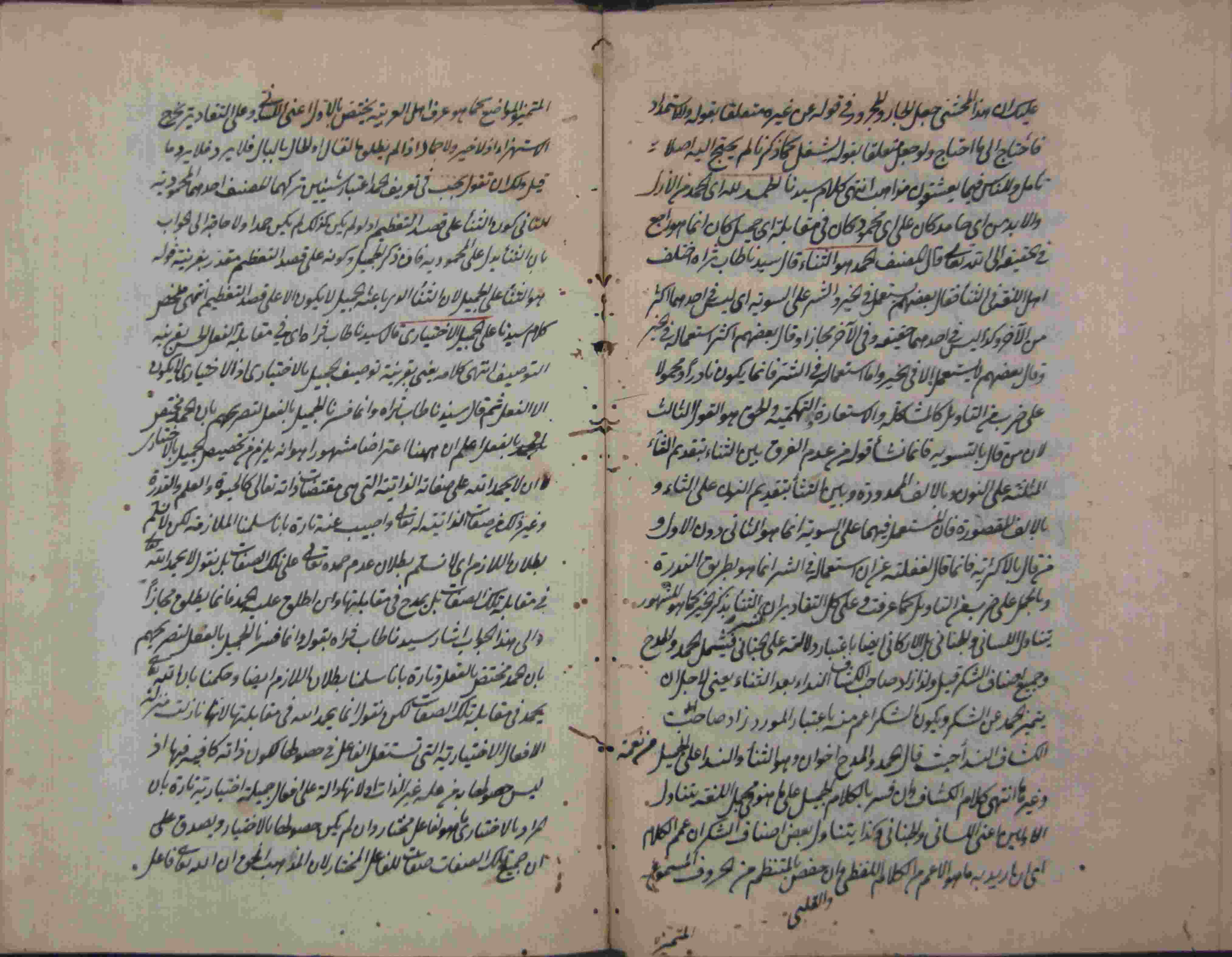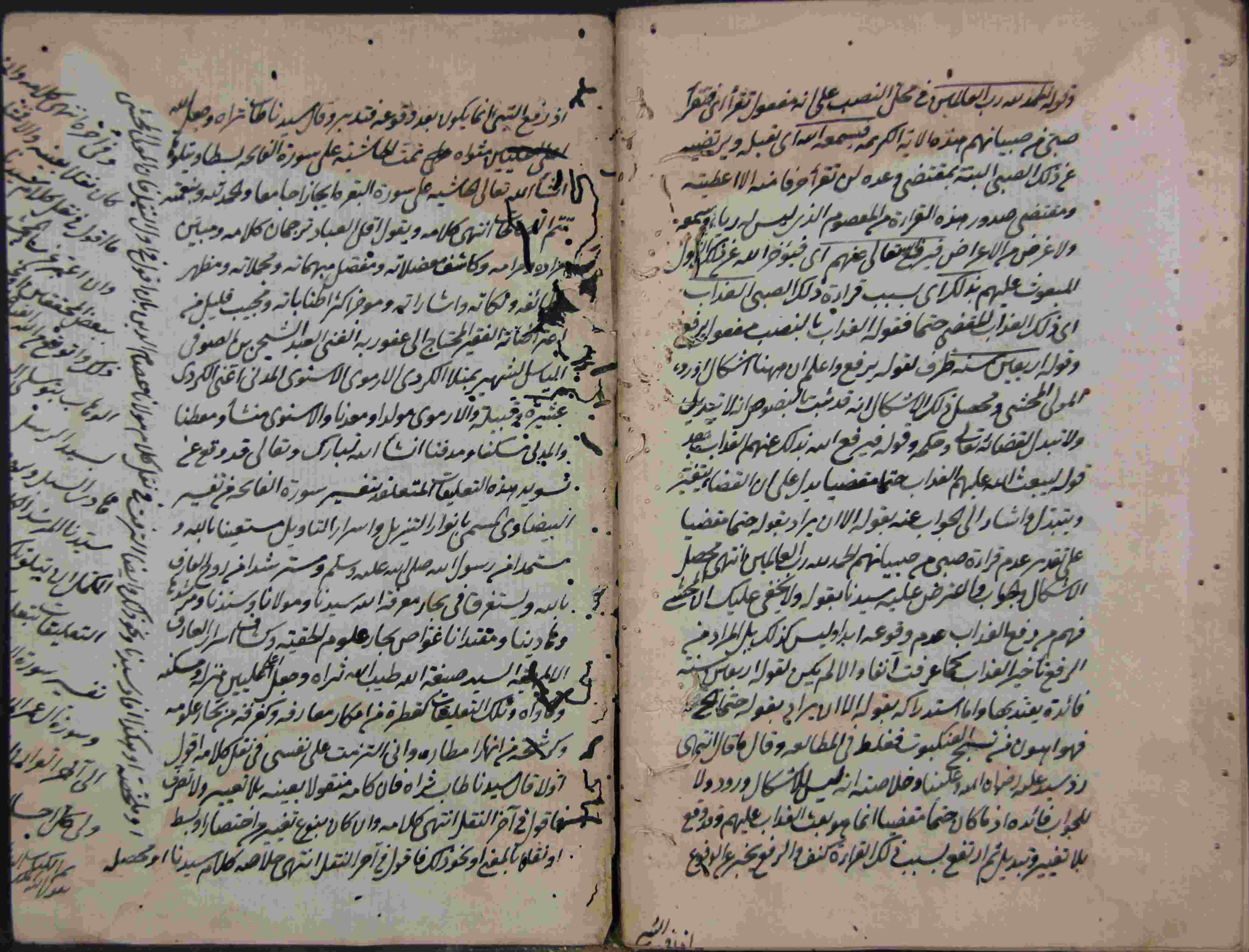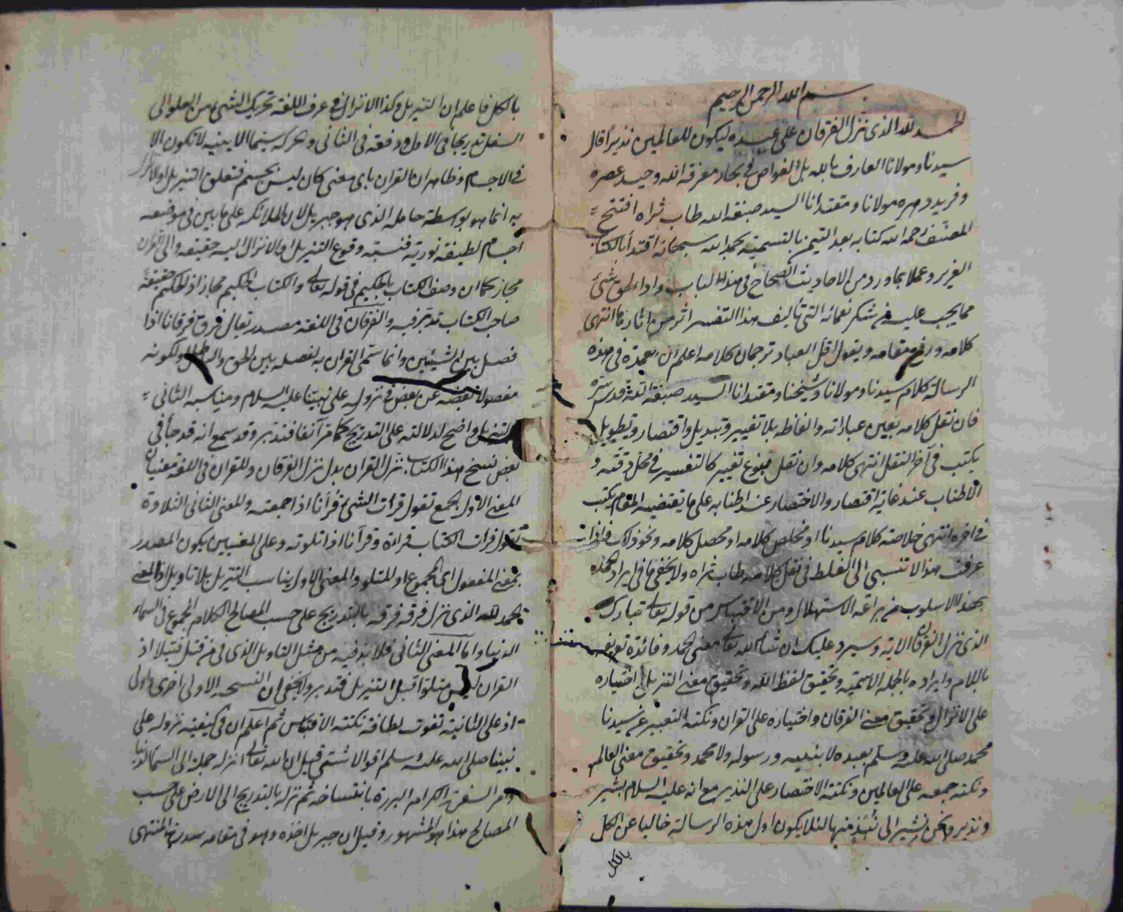 | Description: | أوله : " بسم الله الرحمان الرحيم الحمد لله الذي نزل الفرقان على عبده ليكون للعالمين نذيرا قال سيدنا ومولانا..."/آخره : " أعلى العليين مثواه تمت الحاشية على سورة الفاتحة بسطا ويتلوه إن شاء الله تعالى الحاشية على سورة البقرة إيجازا جامعا والحمد لله "، نوع الخط مشرقي، التجليد مزخرف، حالة المخطوط متوسطة، أثرت عليه الرطوبة في أطرافه وبه ثقوب سببها الأرضة، بهامشه تعليقات، بداية المخطوط في الورقة الثانية، نهاية المخطوط في الورقة 138، المخطوط مرقمن، رقم المخطوط 100 م، مصدر المخطوط : مكتبة الشيخ نعيم النعيمي. |