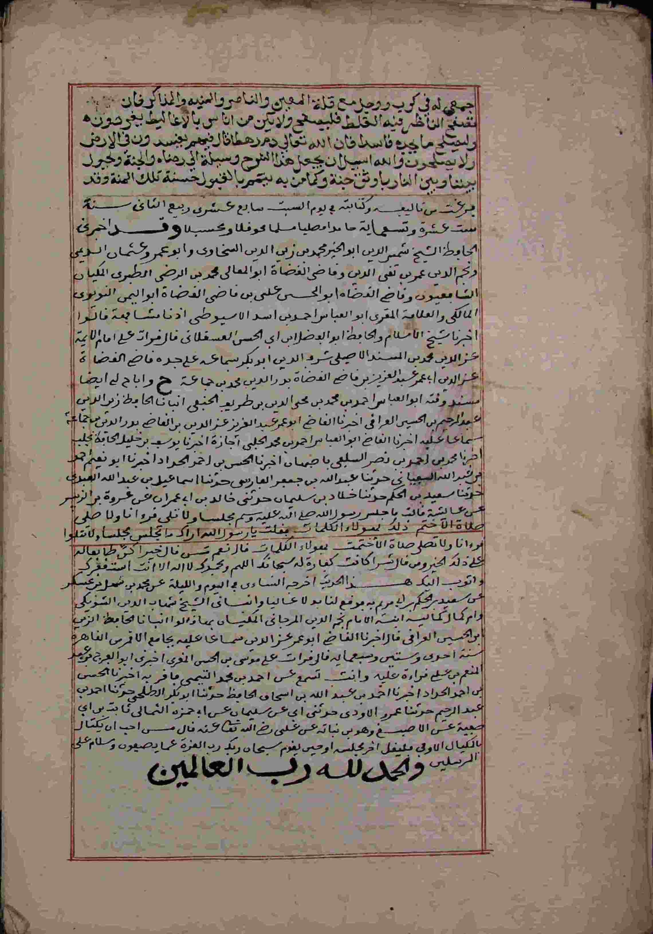 Description: أوله : " بسم الله الرحمان الرحيم رقم في الفرع وأمثلة على البسملة علامة سقوطها..."/آخره : " وكما من به يتمم بالقبول حسنة تلك المنة وقد فرغت من تأليفه وكتابته سنة 916 هـ. "، نوع الخط مشرقي، التجليد مزخرف، حالة المخطوط جيدة، عليه آثار الرطوبة، مكتوب في إطار ملون، عليه تعليقات بالهامش، الجزء الأخير، بداية المخطوط في الورقة الثانية، نهاية المخطوط في الورقة 617، المخطوط مرقمن، رقم المخطوط 120 م، مصدر المخطوط : مكتبة الشيخ نعيم النعيمي ؛ المراجع والمصادر : الأعلام خير الدين الزركلي (2/ 65).