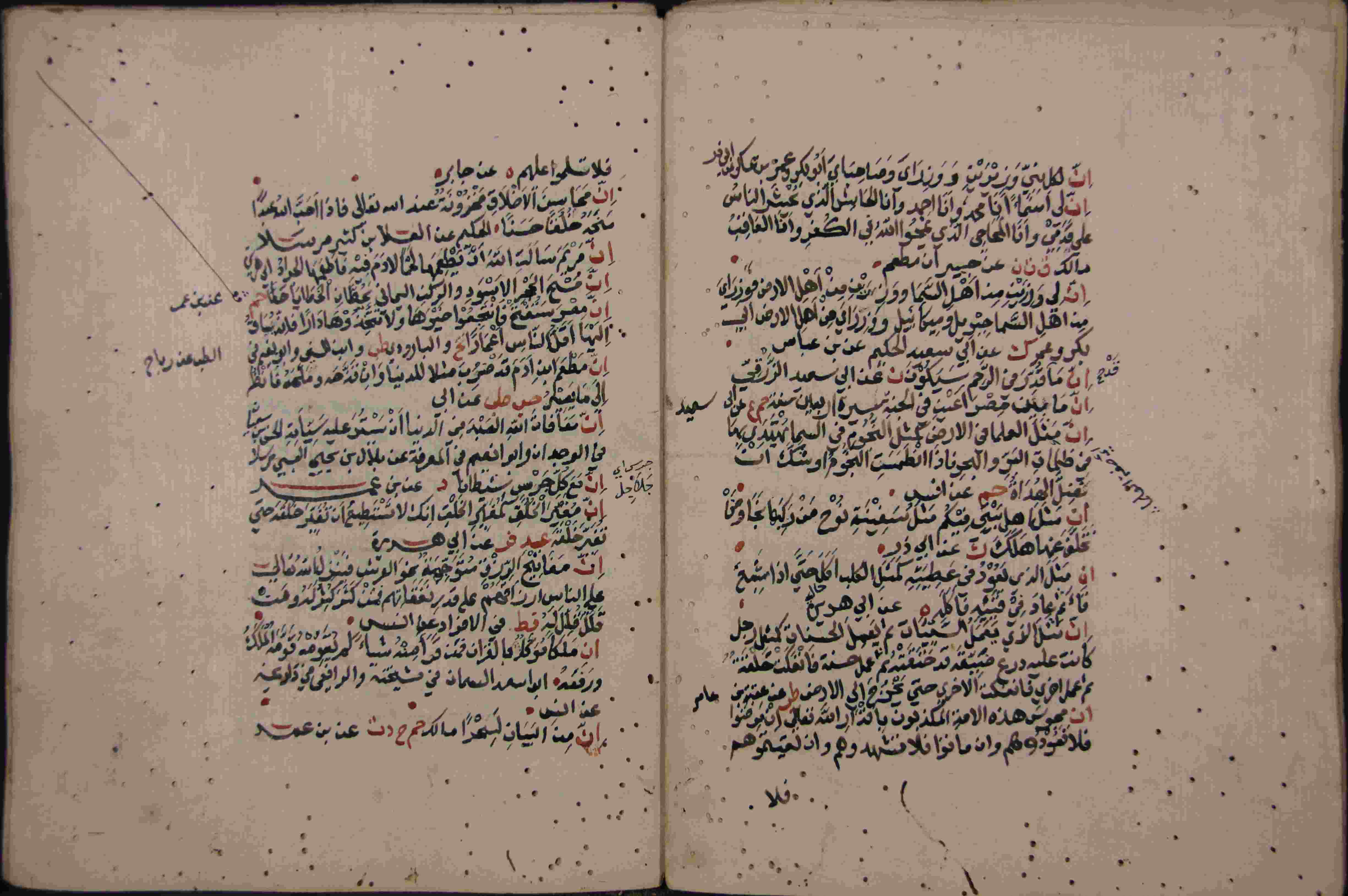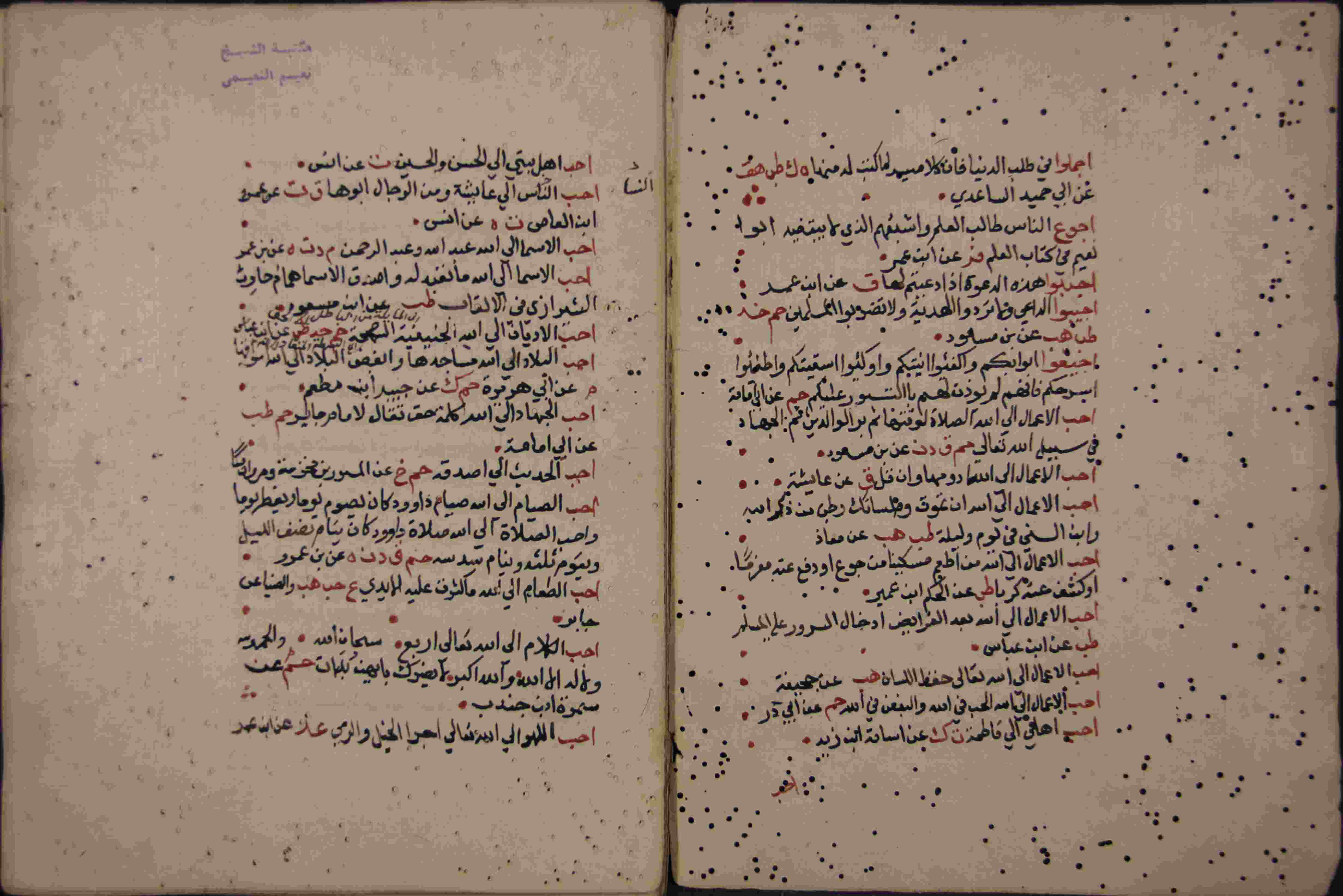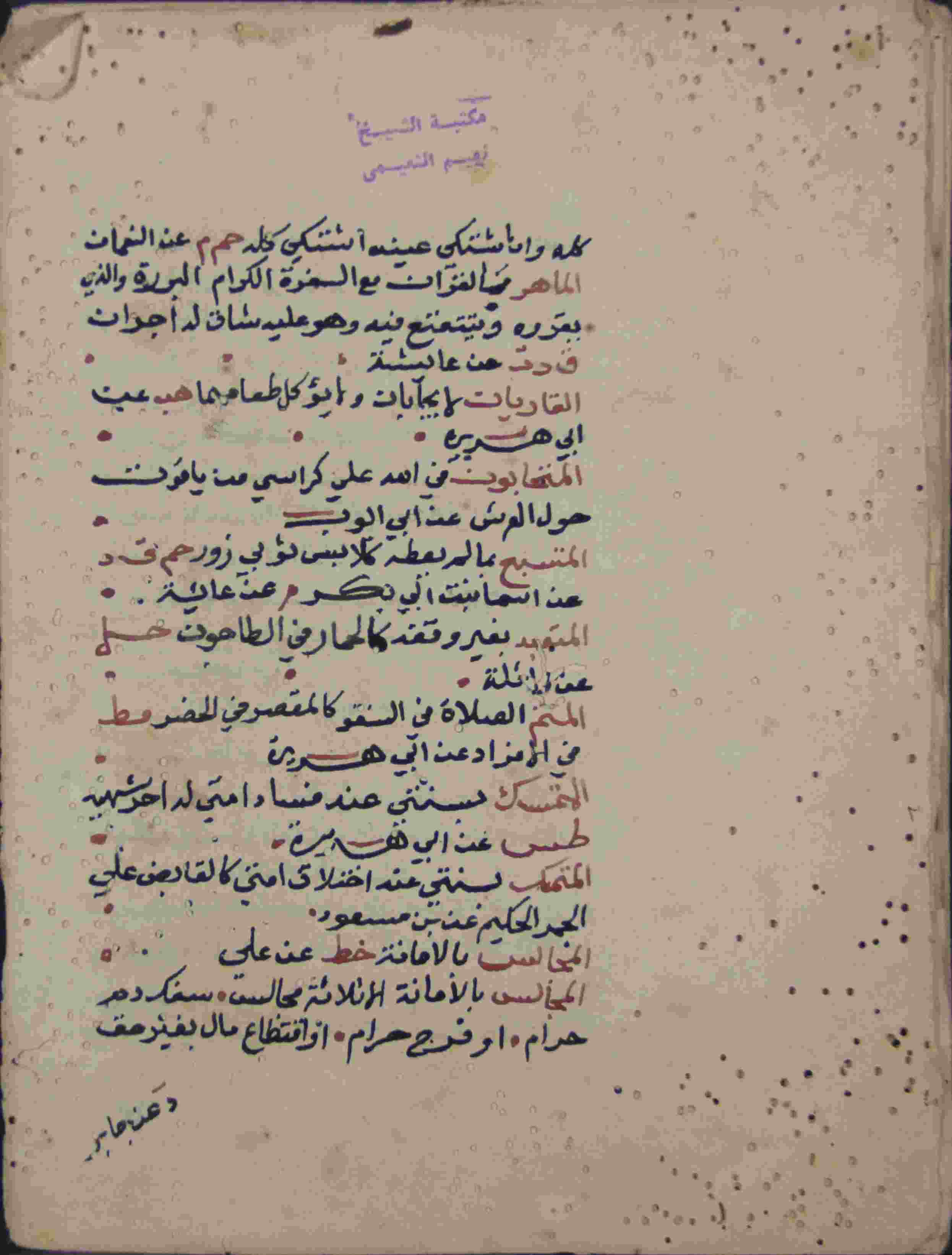 | Description: | أوله : " اجتنبوا ما أسكر الحلواني عن علي اجثوا على الركب ثم قولوا يارب يارب..."/آخره : " المجالس بالأمانة إلا ثلاثة مجالس "، نوع الخط مغربي، التجليد غير مجلد، حالة المخطوط متوسطة، به تعليقات في الحواشي، به سقط من أوله وسطه وآخره، بداية المخطوط في الورقة الأولى، نهاية المخطوط في الورقة 221، المخطوط مرقمن، رقم المخطوط 157 م، مصدر المخطوط : مكتبة الشيخ نعيم النعيمي ؛ المراجع والمصادر : معجم المؤلفين (5/ 128). |