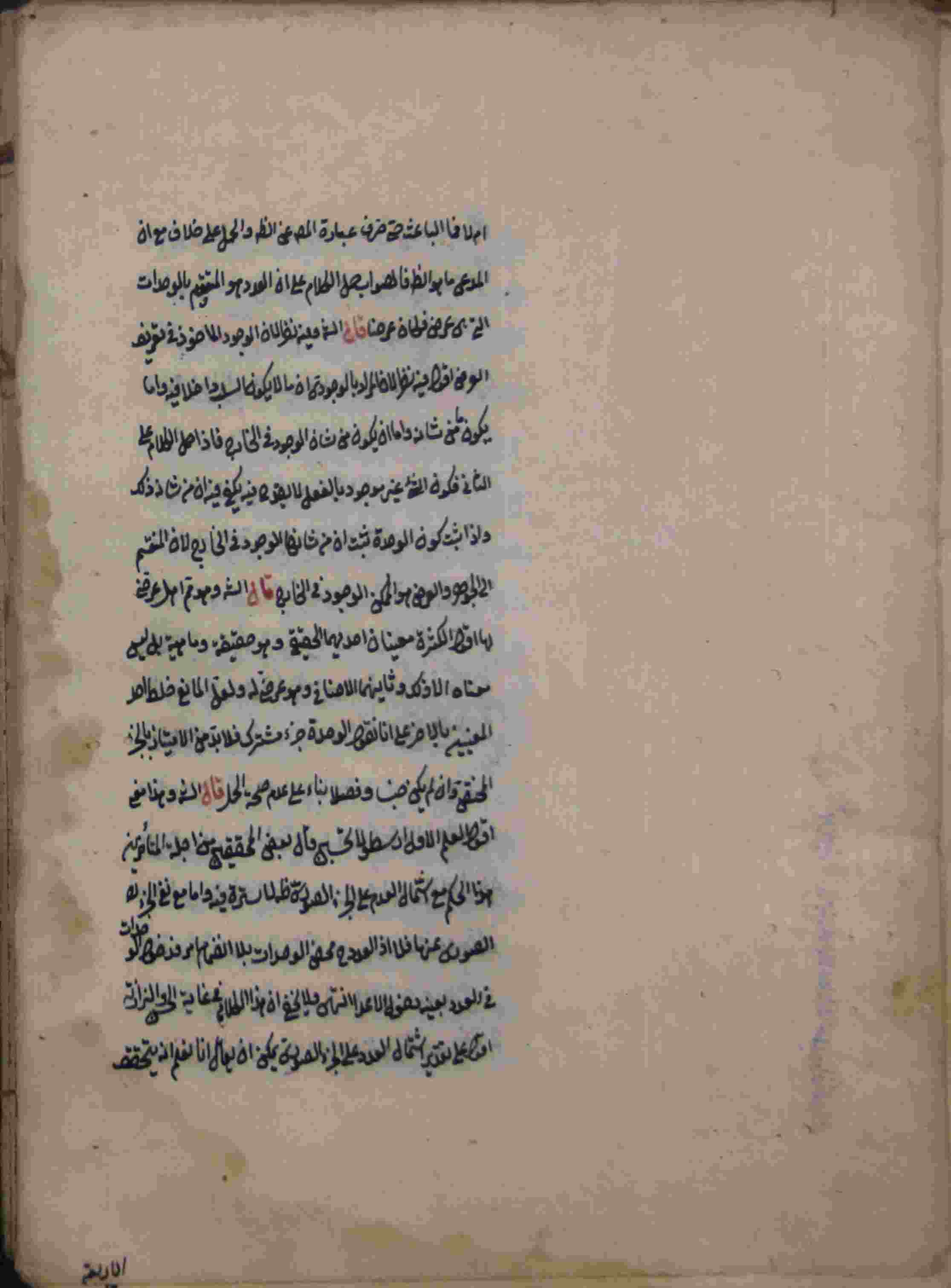 | Description: | أوله : " الحمد لله رب العالمين والصلاة والسلام على سيدنا محمد وآله أجمعين قال الحكمة إستكمال النفس أي الإستكمال مصدر والمصادر قد تطلق ويراد بها معانيها..."/ آخره : " على تقدير إشتمال العدد على الجزء الصوري يمكن أن يقال إنا نعلم أنه يتحقق "، عدد الأوراق الخاصة به 113 ورقة، نوع الخط مشرقي، التجليد غير مجلد، حالة المخطوط متوسطة، بداية المخطوط في الورقة 89، نهاية المخطوط في الورقة 201، المخطوط مرقمن، رقم المخطوط 2.2 / 183 م، مصدر المخطوط : مكتبة الشيخ نعيم النعيمي. |