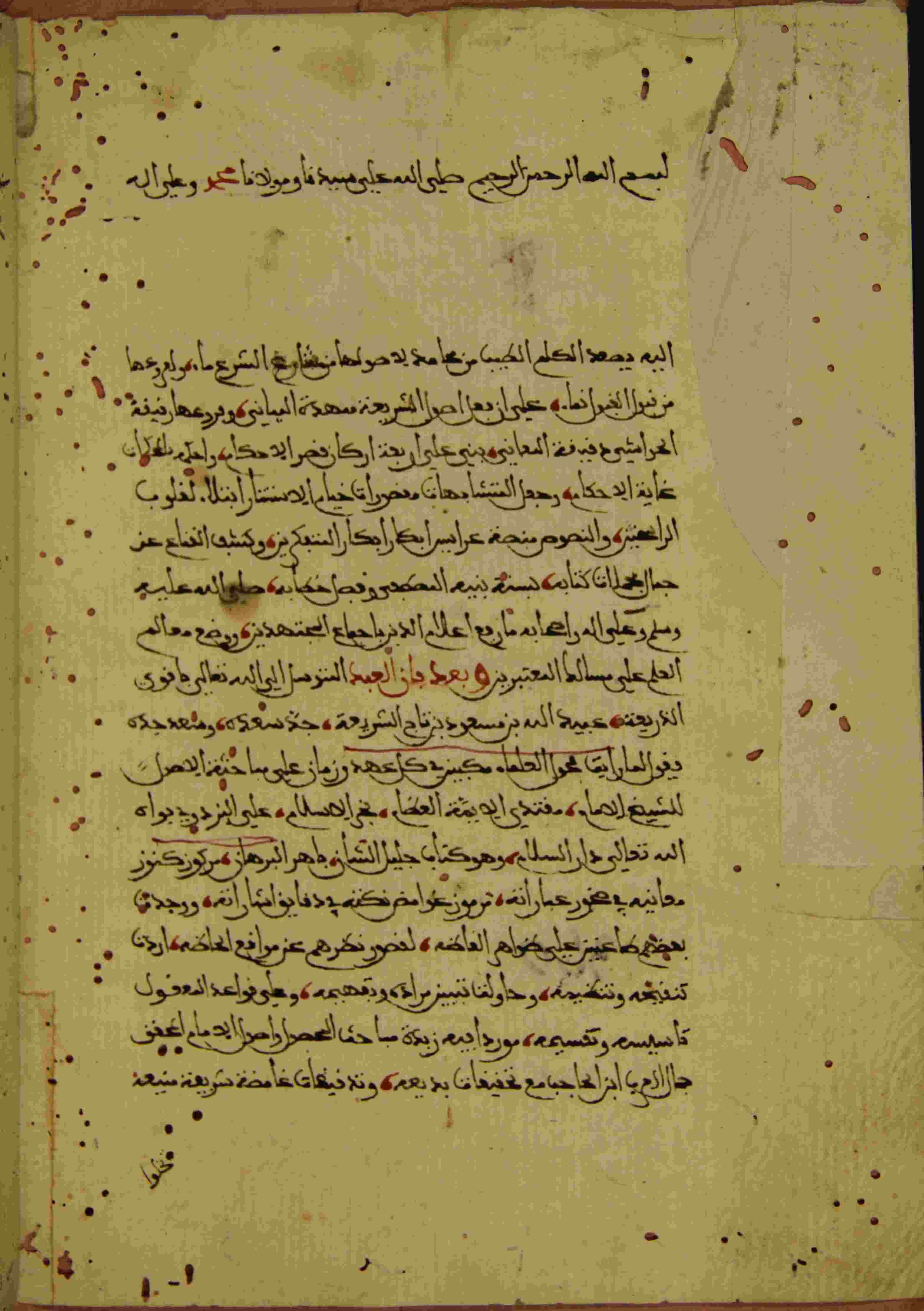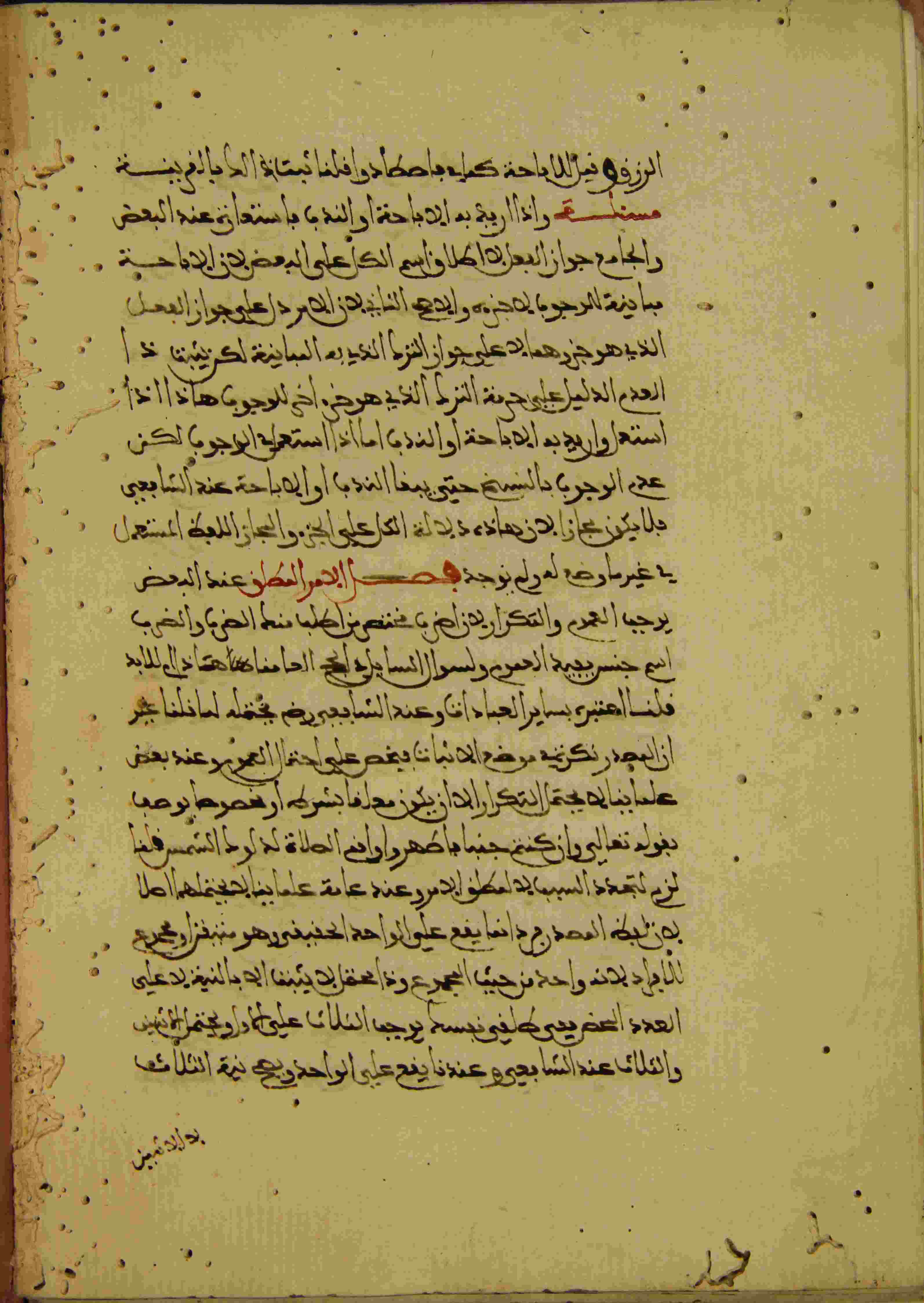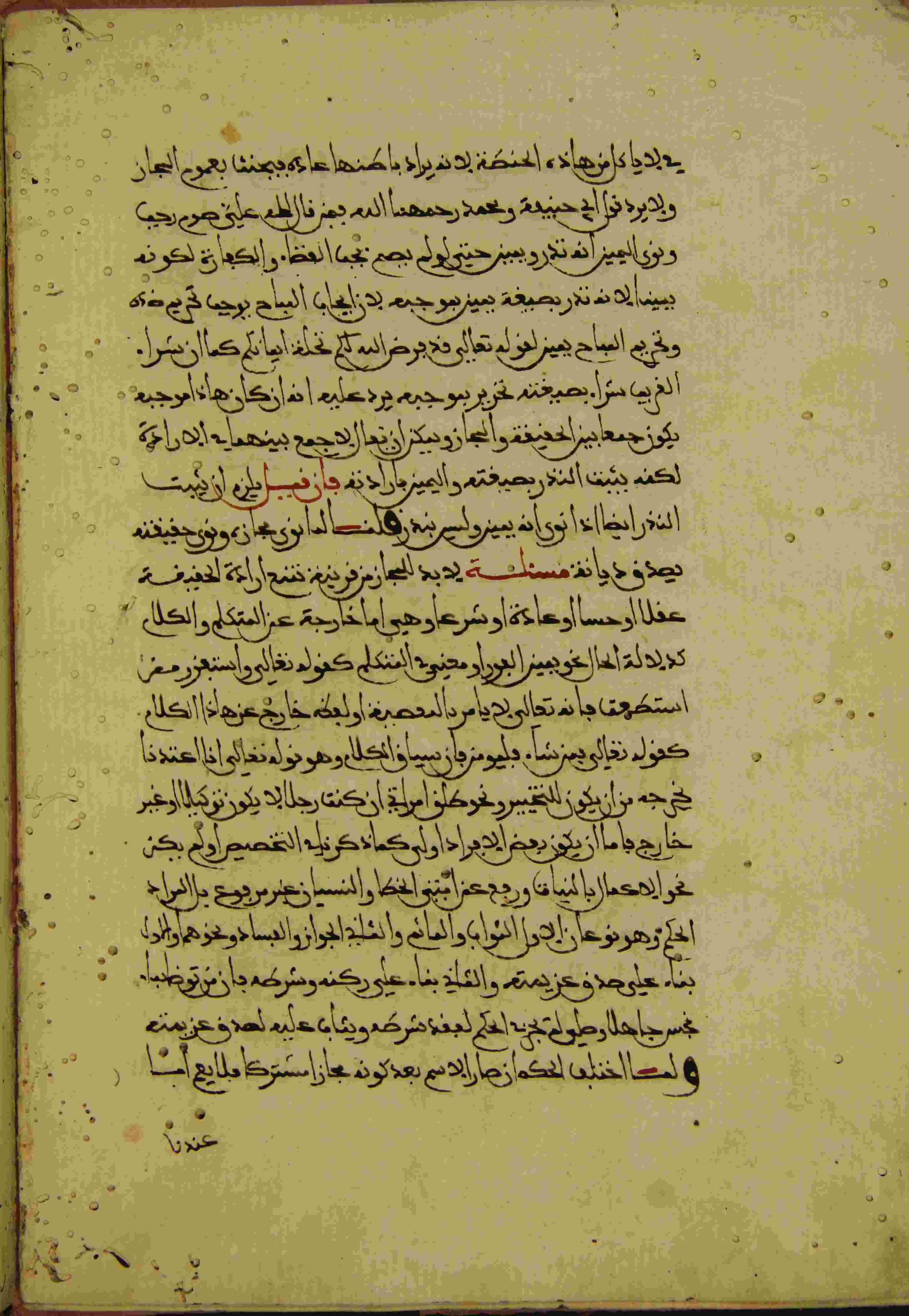 | Description: | أوله : " بسم الله الرحمان الرحيم وصلى الله على سيدنا ومولانا محمد وعلى آله إليه يصعد الكلم الطيب من محامد..."/ آخره : " والثلاث عند الشافعي وعندنا يقع على الواحد ويصح نية الثلاث "، نوع الخط مغربي، التجليد غير مجلد، حالة المخطوط متوسطة، بداية المخطوط في الورقة الأولى، نهاية المخطوط في الورقة 20، الأوراق الأولى من الكتاب هي الموجودة فقط، به ثقوب، منزوع الغلاف، تملكه بالشراء المدفوع بالتمر محمد الملقب بن الحاج مختار بن وطاف في 11 جمادى الأولى سنة 1248 هـ.، بداية المخطوط في الورقة الأولى، نهاية المخطوط في الورقة 20، المخطوط مرقمن، رقم المخطوط 227 م، مصدر المخطوط : مكتبة الشيخ نعيم النعيمي. |