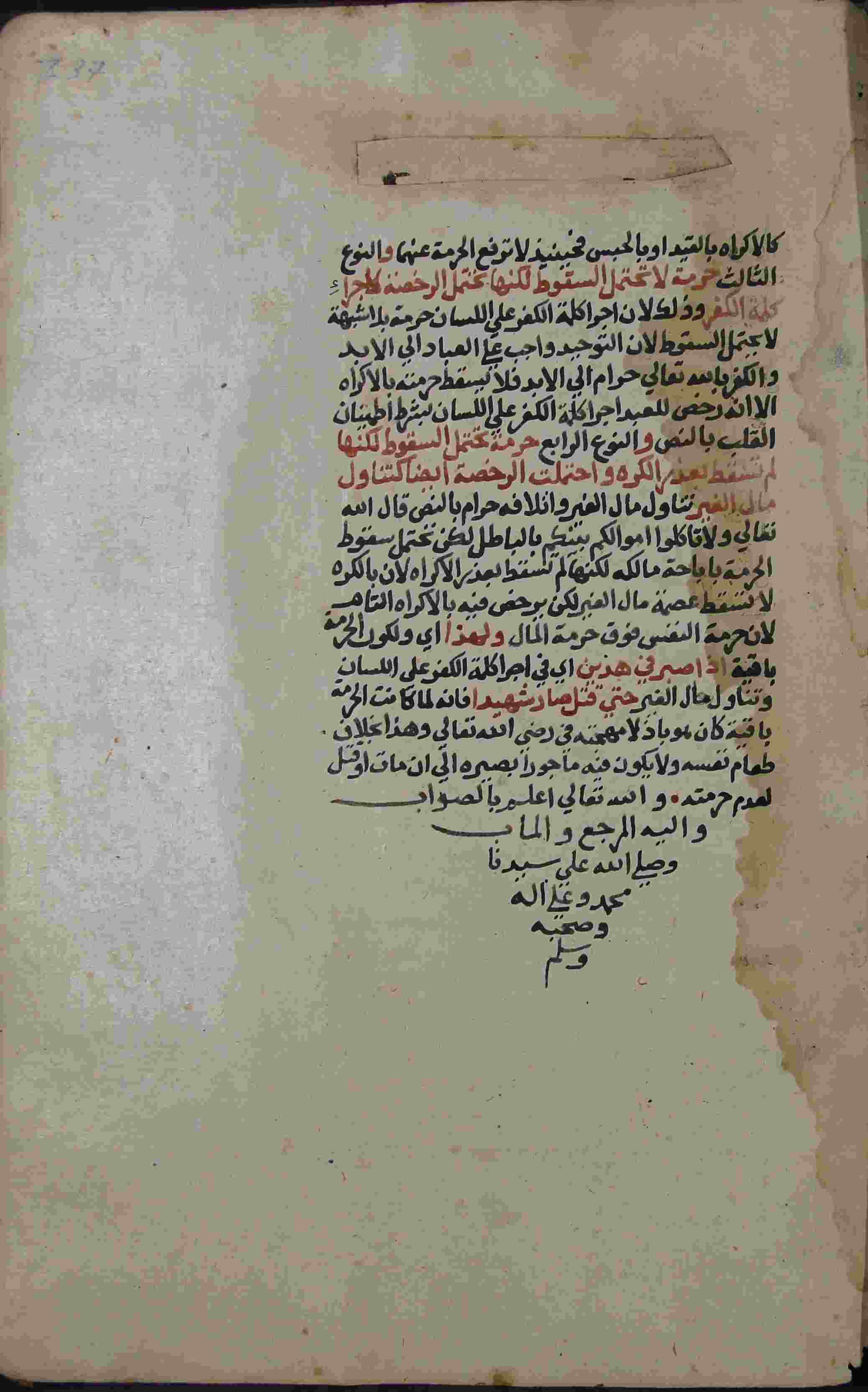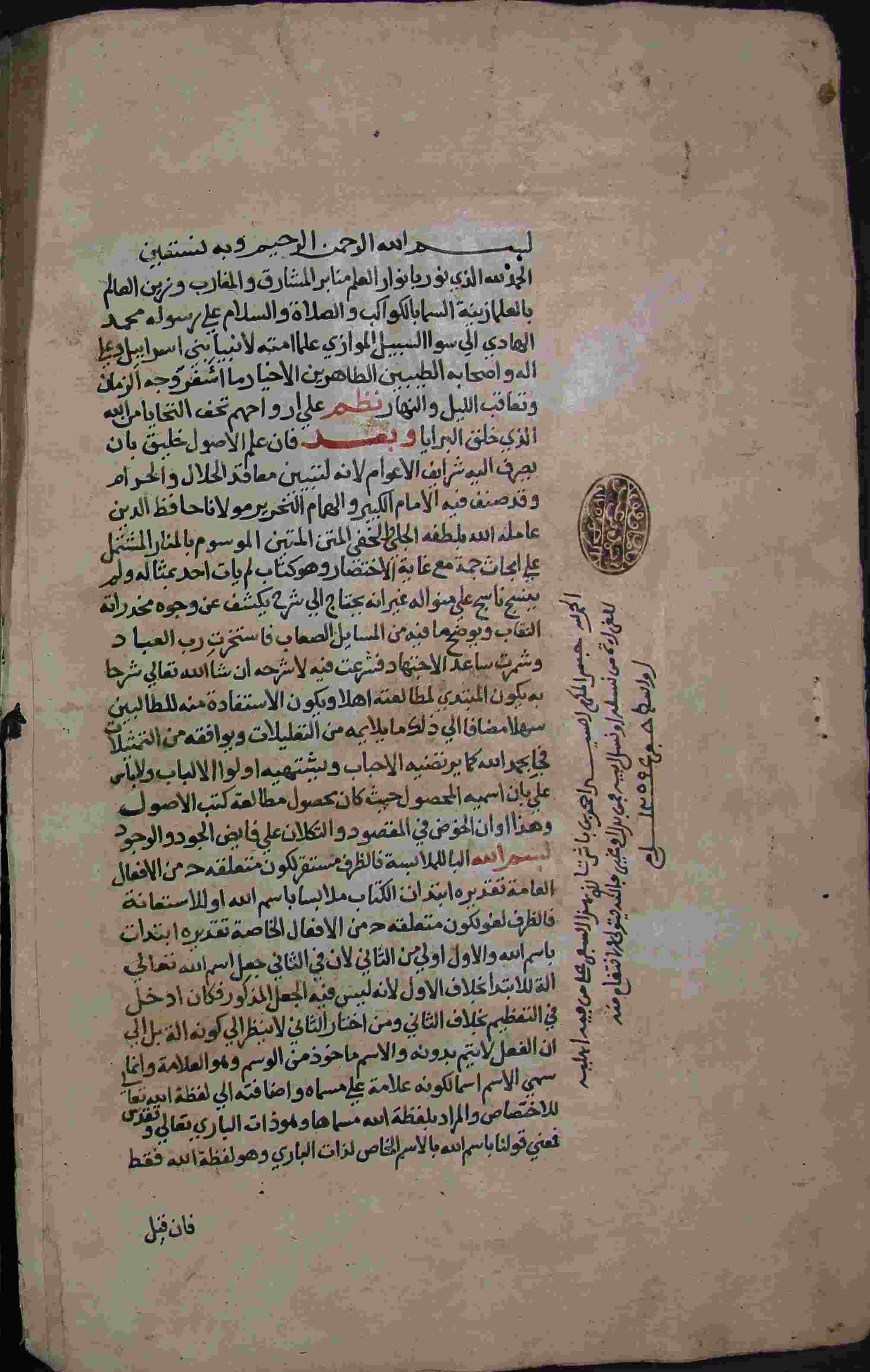 | Description: | أوله : " فإن علم الأصول خليق بأن يصرف إيه شرايف الأعوام لأنه لتبيين معاقد الحلال والحرام..."/آخره : " ولا يكون فيه مأجور بصيرة إلى أن مات أو قتل لعدم حرمته والله تعالى أعلم بالصواب "، نوع الخط مشرقي، منزوع الغلاف، حالة المخطوط جيدة، اعتمد على نظام التعقيبة في الترتيب، بعض أوراقه ملتصقة، حبس السيد أحمد سنة 1259 هـ.، بهامشه تعليقات، بداية المخطوط في الورقة الثانية، نهاية المخطوط في الورقة 137، المخطوط مرقمن، رقم المخطوط 232 م، مصدر المخطوط : مكتبة الشيخ نعيم النعيمي ؛ المراجع والمصادر : الأعلام خير الدين الزركلي (1/ 94). |