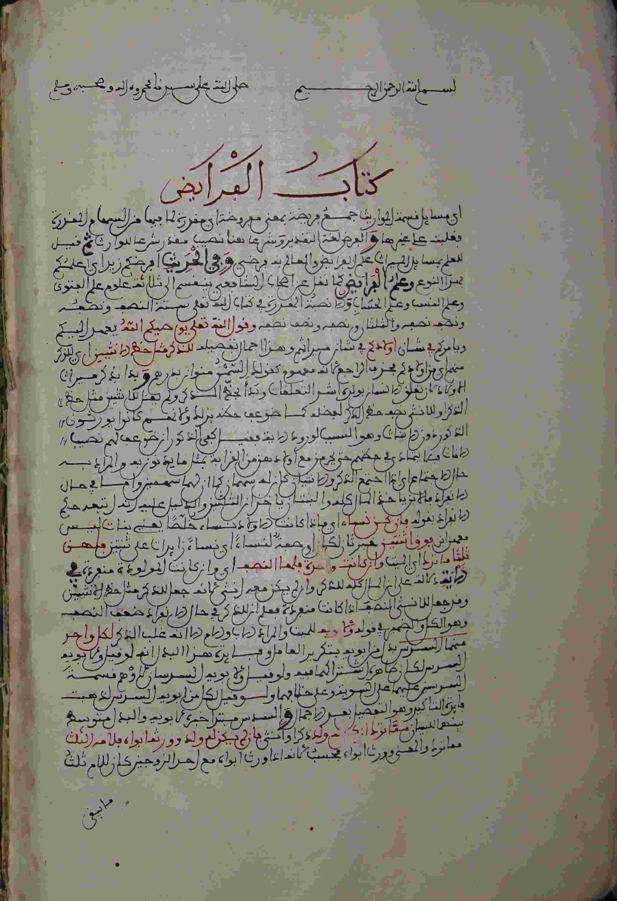 Description: أوله : " بعد البسملة، إن مسائل قسمة المواريث جمع فريضة بمعنى مفروضتان مقررة لما فيها من السهام المقررة..."/آخره : " وكان الفراغ منه يوم الإثنين السادس عشر من جمادى الأخير 1170هـ."، نوع الخط نسخي، التجليد مزخرف، حالة المخطوط حسنة، تعاليق وشروح على الحواشي، مجلد بزخرفة مكبوسة على البارد، سنة التأليف 916 هـ.، بداية المخطوط في الورقة 11، نهاية المخطوط في الورقة 289، المخطوط مرقمن، رقم المخطوط 246 م، مصدر المخطوط : مكتبة الشيوخ ؛ المراجع والمصادر : الأعلام 6/258، مداخل المؤلفين 70.