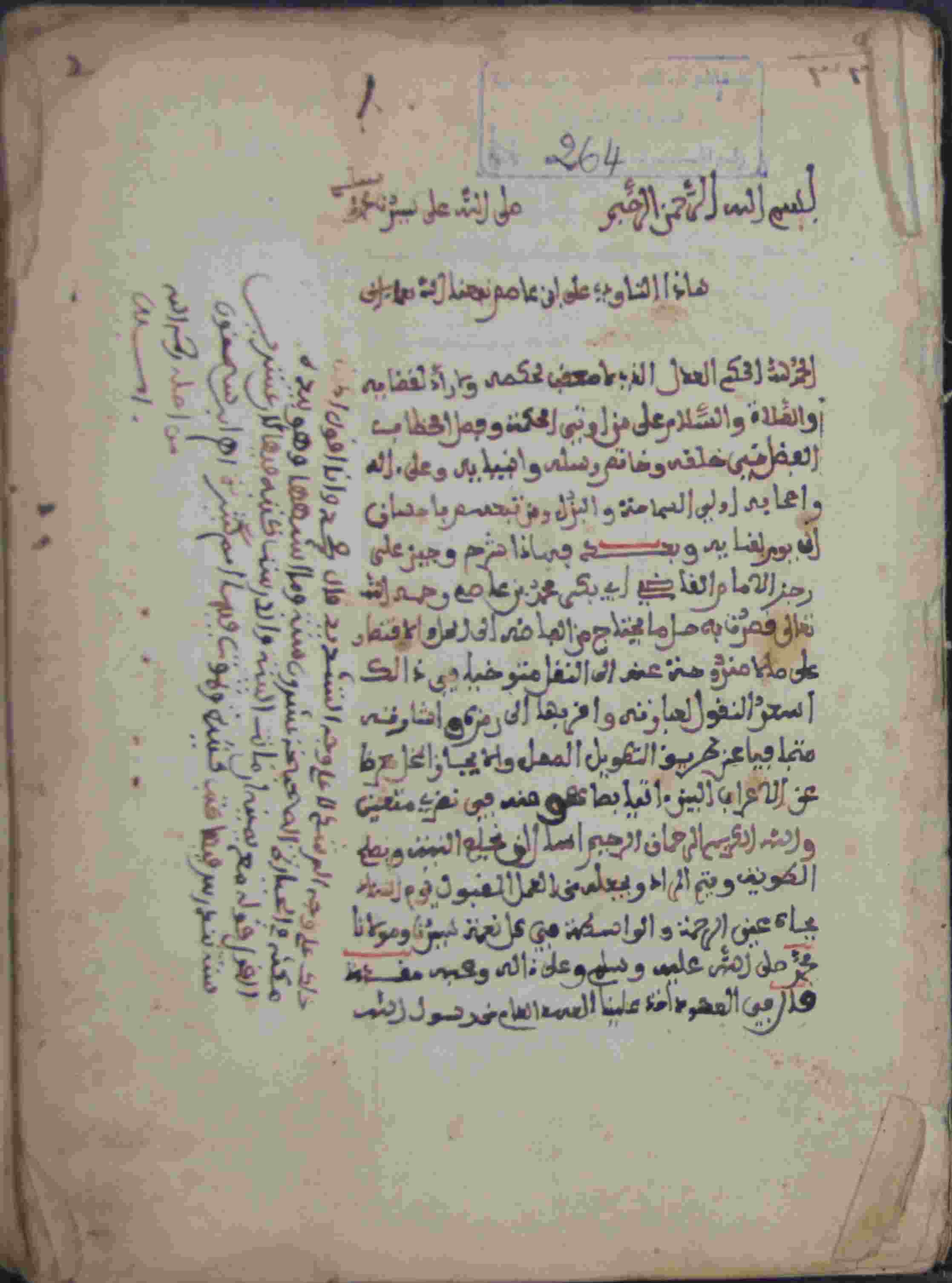 | Description: | أوله : " الحمد لله الحكم العدل الذي لا معقب لحكمه ولا راد لقضائه والصلاة والسلام على من أوتي الحكمة وفصل الخطاب..."/آخره : " وينظم قوله بالصلاة ختمه كما ابتدي لقول ابن دريدي أنها باسم الذي ختمها بحمده...والحمد لله رب العالمين "، نوع الخط مغربي، التجليد عادي، حالة المخطوط حسنة، بهامشه تعليقات، كان الفراغ منها يوم السبت 19 ربيع الثاني 1272 هـ.، المخطوط مرقمن، رقم المخطوط 264 م، مصدر المخطوط : مكتبة الشيخ نعيم النعيمي ؛ المراجع والمصادر : الأعلام خير الدين الزركلي (13/ 149). |